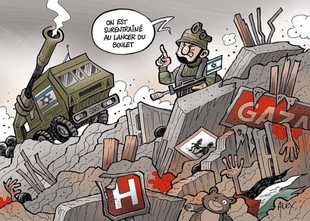 در این کاریکاتور، ارتش رژیم صهیونیستی پس از ویرانی کامل بیمارستان و مدرسه میگوید: «ما بیش از حد در پرتاب وزنه تمرین کردهایم».